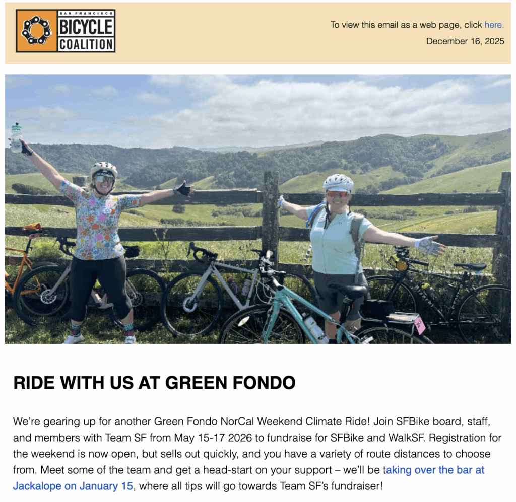 If you decide to organize training rides, group fundraisers, form a team, or host an informational session (details below), you’ll have fresh and fun content to share with your audience.