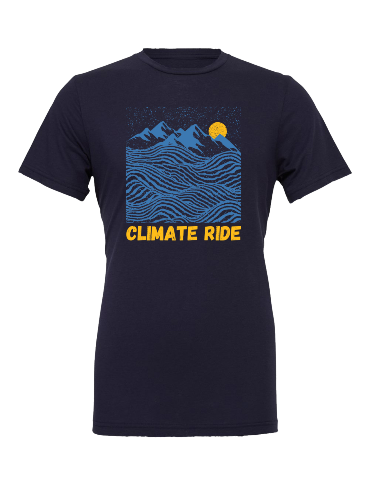 Sport your love for Climate Ride with this wavy mountain scene! Super soft navy t-shirt in unisex sizing. The perfect shirt to slip into for your post-ride or hike hangs 😉